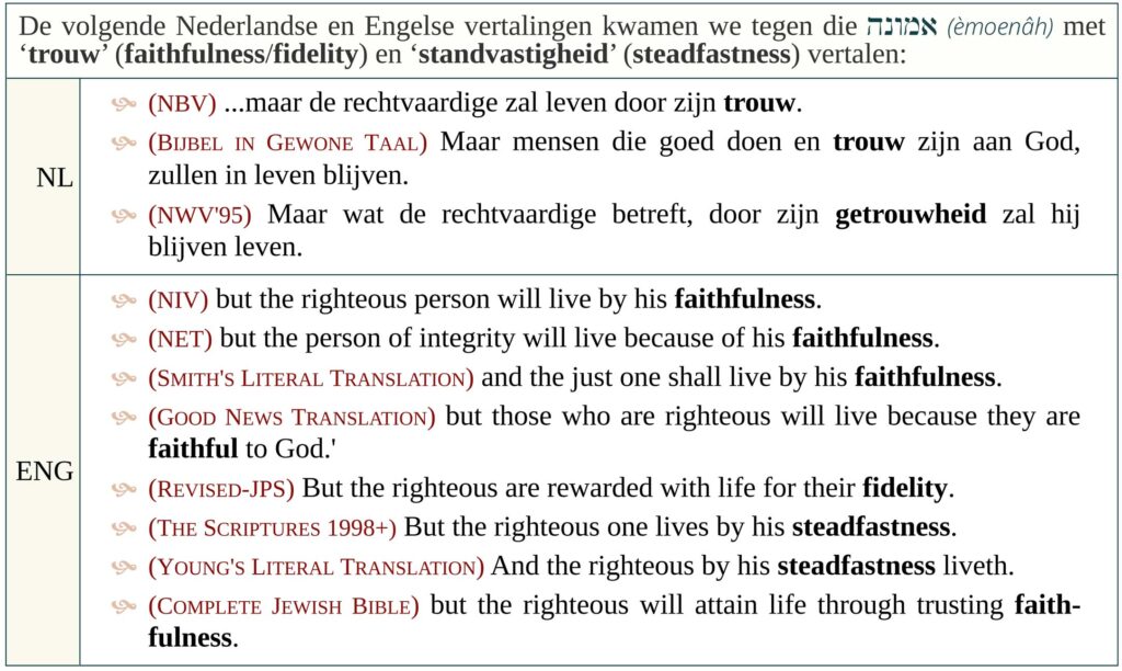 Het woord אמונה (èmoenâh) komt zo’n 49 keer voor in de Wet, de Profeten en de Geschriften (Tanach/OT) en wordt door de vertalers van de “Statenvertaling” twee keer vertaald met het woord ‘geloof’. (Hos 2:19 & Hab 2:4) De “Herziene Statenvertaling” en de “King James Version” vertalen dit woord één keer met ‘geloof’ en dat hebben ze gedaan in Habakuk 2:4. Nu, de vraag is: waarom hebben de vertalers אמונה (èmoenâh) op deze plaats anders vertaald dan elders? Zouden vertalers dit gedaan hebben, zodat hun vertaling van Habakuk overeenkomt met hun vertaling en interpretatie van de woorden van Paulus, wanneer hij Habakuk citeert in zijn brieven? Heeft men een probleem als Habakuk in werkelijkheid spreekt over de ’trouw’ of ‘standvastigheid’ van de rechtvaardige in plaats van alleen zijn ‘geloof’? Niet alle vertalingen vertalen het woord אמונה (èmoenâh) in Habakuk 2:4B met ‘geloof’.