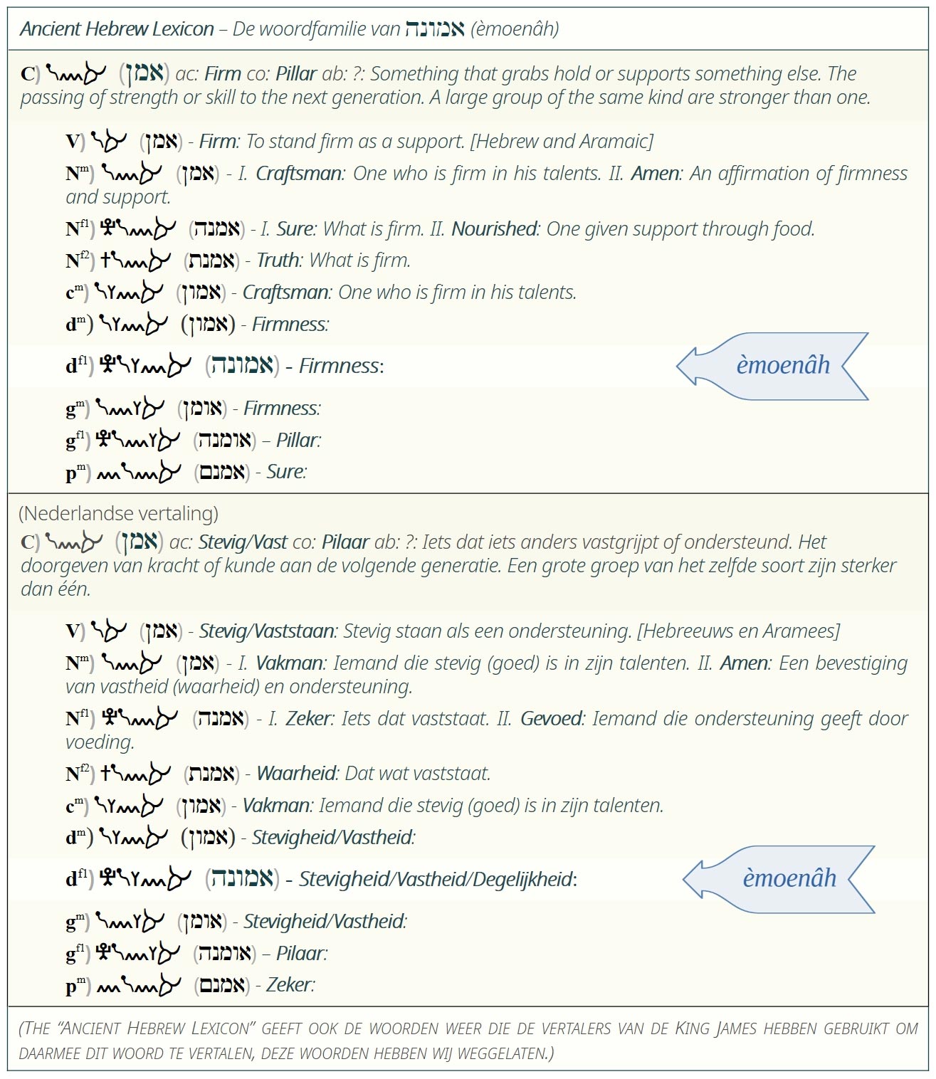 Woorden in de Hebreeuwse taal maken deel uit van een woordfamilie. Door te kijken naar de hele woordfamilie en niet alleen naar één woord (een lid van die familie), kan zeker helpen om een woord beter te begrijpen. Net als bij een familie van mensen, waarbij de familieleden overeenkomsten en eigenschappen met elkaar delen, delen ook de woorden binnen een Hebreeuwse woordfamilie overeenkomsten. Hier is een overzicht uit het woordenboek “Ancient Hebrew Lexicon” van de woordfamilie waartoe אמונה (èmoenâh) behoort.