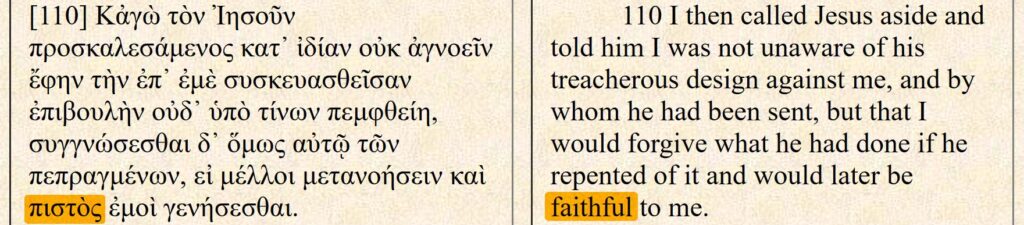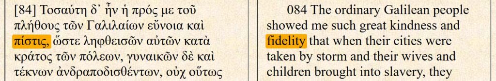 “Volhard in uw πίστις(pistis)” klinkt als een oproep uit de Bijbel. Maar vraagt koning Demetrius hier om het geloof van de Joden, of om hun loyaliteit / trouw? In de tijd van de apostelen was er een Joodse generaal genaamd Josephus. In de Griekse tekst van “The Life of Flavius Josephus” komt het woord pistis / pistos in verschillende vervoegingen voor en wordt daarmee hoogstwaarschijnlijk altijd trouw / loyaliteit bedoeld. Hier volgen een paar citaten met een Engelse vertaling er naast.